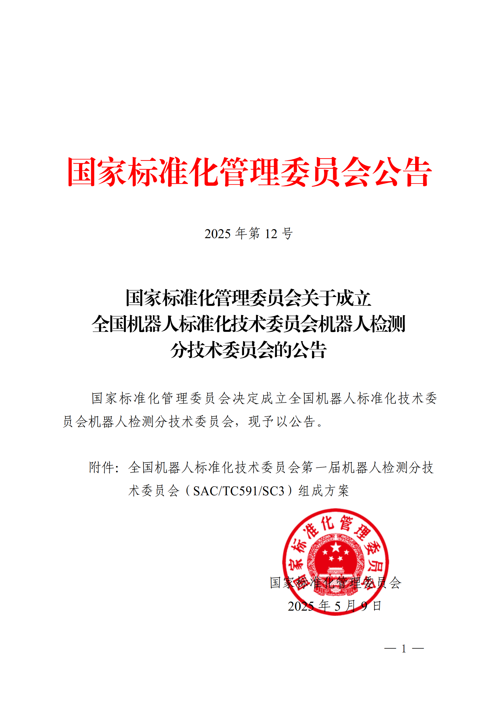 5月9日,国家标准化管理委员会发布《关于成立全国机器人标准化技术委员会机器人检测分技术委员会的公告》,决定成立全国机器人标准化技术委员会机器人检测分技术委员会(以下简称:分技术委员会),主要负责全国机器人检测与评估领域标准化工作,秘书处由上海电器科学今年会jinnianhui承担,我院专家邢琳任委员兼秘书长。