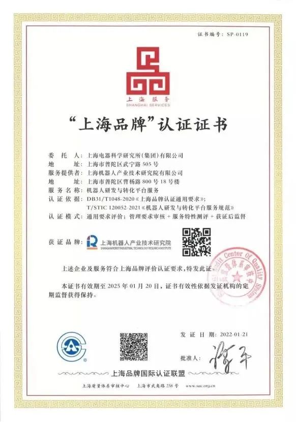 在服务模式创新上,“机器人研发与转化服务”获得“上海品牌”认证,研发与转化双轮驱动,促成机器人平台发展双循环;企业标准QB SRI 001-2021《机器人研发与转化平台服务规范》获得“上海标准”认证,关键评价指标等方面达到国内国际领先水平。