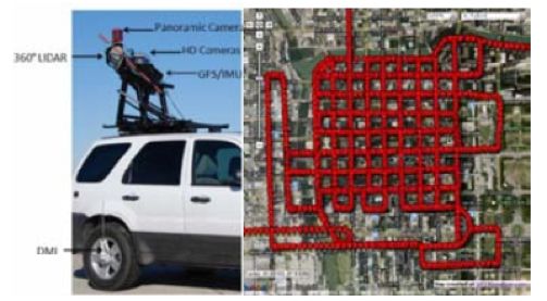 360°的激光雷达(LIDAR)传感器(Velodyne HDL-64E)应用于移动测绘系统,结合全景相机,高清晰度摄影机, 全球定位系统(GPS),惯性测量装置(IMU)、测距仪(DMI)可实现周围环境的数据集采样。如图3左图为一个移动测绘系统数据采集装置,右图为采集街景数据覆盖的地理区域。